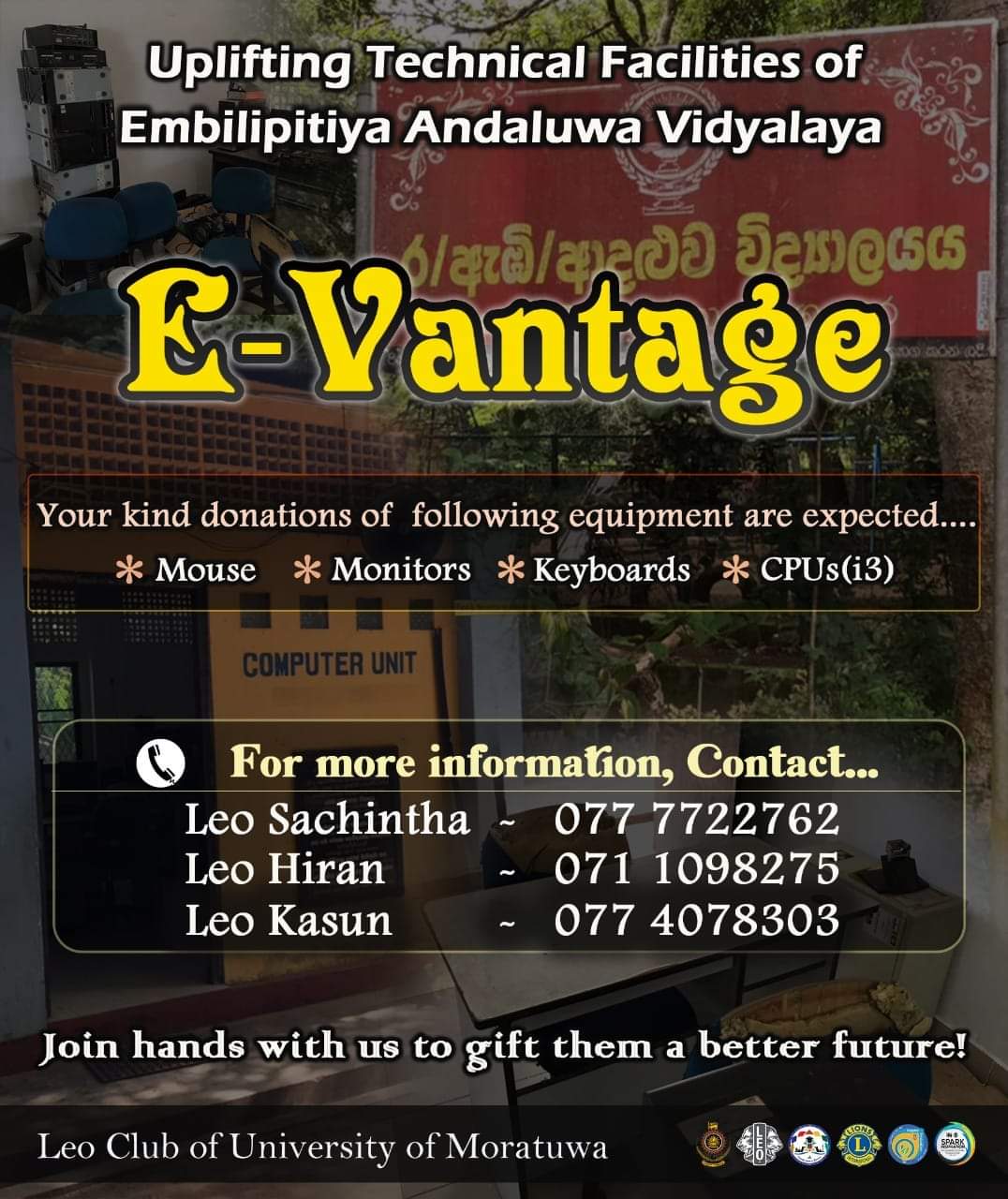 Therefore we, the Leo Club of University of Moratuwa thought to conduct "E - Vantage" a project to donate computers for R/EMB/Andoluwa College. Although lots of the students in this school are willing to select ICT for the O/L examination, the limited facilities have made them hesitant. Having only one computer for the entire school have impacted badly the ICT literacy of the students.